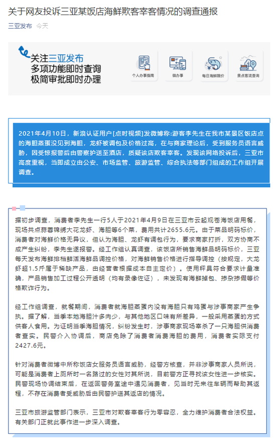 4月11日,三亚发布通报:经工作组调查,该饭店所销售海鲜品明码标价,未发现有海鲜掉包、掺杂掺假等价格欺诈行为。