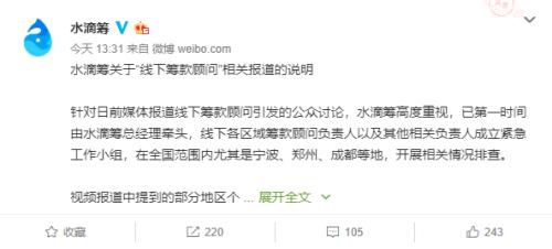 当年11月30日下午,水滴筹在其官方微博发声明称,水滴筹高度重视,已第一时间由水滴筹总经理牵头,线下各区域筹款顾问负责人以及其他相关负责人成立紧急工作小组,在全国范围内尤其是宁波、郑州、成都等地,开展相关情况排查。