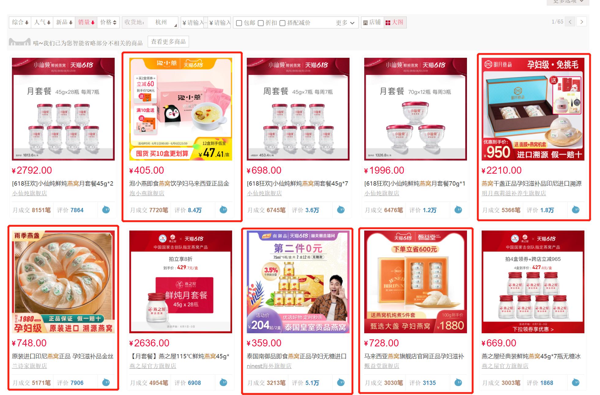 孕产宣传争议的背后,浮现出燕窝行业在电商平台的一大趋势——聚焦孕产群体。6月1日,新京报记者在天猫平台搜索“燕窝”时发现,按销量排序,前20款商品中,9款标题中含有“孕妇”字样,产品形态包括燕盏、即食燕窝、鲜炖燕窝以及概念性添加燕窝的冲泡饮品。而以“燕窝 孕妇”为关键词进行搜索,天猫平台显示相关产品链接约2.96万个,京东平台显示相关产品链接约1.5万个。