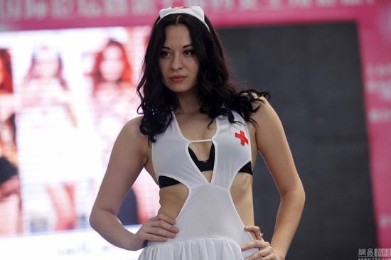 2016年6月3日,陕西西安,2016新丝路中国(西安)幸福之道国际论坛暨第七届中国西安生殖健康产业博览会在西安曲江会展中心开幕。美女模特身着情趣装T台走秀、热辣钢管舞表演,引来市民热情围观。