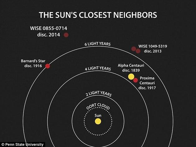 这张图像展示的是距离太阳最近的一些恒星系统的位置。恒星系统名字后面的年份是它们的距离值被测定出来的年份
