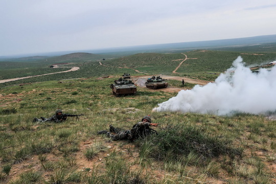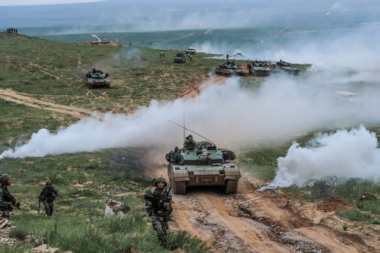倍受军迷关注的跨越-2016·朱日和A演习实兵对抗阵地进攻战阶段已经于7月19日开始。首场对抗演习中,常年负责反“台独”应急战备第一线任务的第1集团军某装甲旅,展示了超强的作战能力,成功攻入蓝军核心阵地,结束红蓝首战对抗,转入下一行动演练。