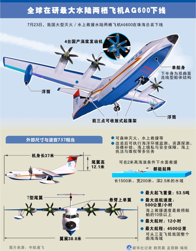 我国自主研制的“三个大飞机”之一,也是当今世界上在研的最大一款水陆两栖飞机AG600,23日在此间总装下线。据悉,其续航能力更能保证它飞抵中国最南端的曾母暗沙并盘旋作业两小时。