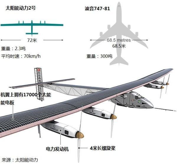 “阳光动力2号”翼展达到72米,比波音747还宽,重量仅2.3吨,相当于一辆家用汽车。