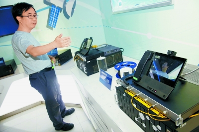潘建伟院士演示实用化量子通信产品进行远距离保密通话。