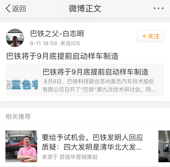 界面新闻记者拨打华赢凯来客服电话询问能否投资巴铁基金时,得到回应称,华赢凯来与巴铁公司是两家独立运营的公司,“我们这边儿管不了巴铁。”与此同时,一位投资者却收到了华赢凯来某客户经理发来的宣传文章——《巴铁将于9月底提前启动样车制造》,华赢凯来董事长白丹青名也利用其“巴铁之父-白志明”的微博账号对该篇文章进行了转发。