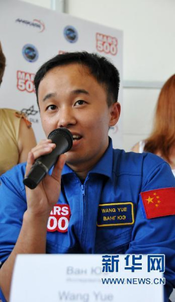 王跃身穿镶有“火星-500”标志的蓝色舱内工作服