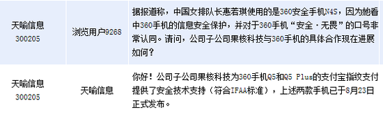 天喻信息回应,公司子公司果核科技为360手机Q5和Q5 Plus的支付宝指纹支付提供了安全技术支持(符合IFAA标准),上述两款手机已于8月23日正式发布。