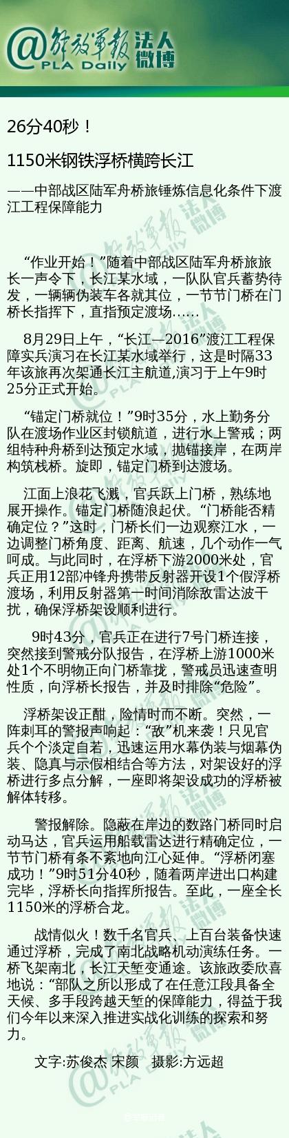 8月29日上午,“长江—2016”渡江工程保障实兵演习在长江某水域举行。时隔33年,中部战区陆军舟桥旅再次架通长江主航道。