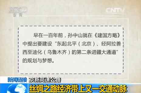 按照国家提出的“丝绸之路经济带及孟中印缅、中巴经济走廊综合交通通道”构想,丝绸之路经济带的中段通道,由3条国家高速公路和国家干线铁路并行组成,分别是北通道、中通道和南通道。其中,北通道就是由京新高速公路和北京到乌鲁木齐的铁路共同组成。
