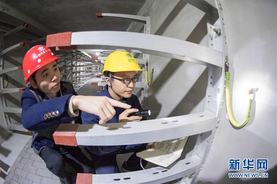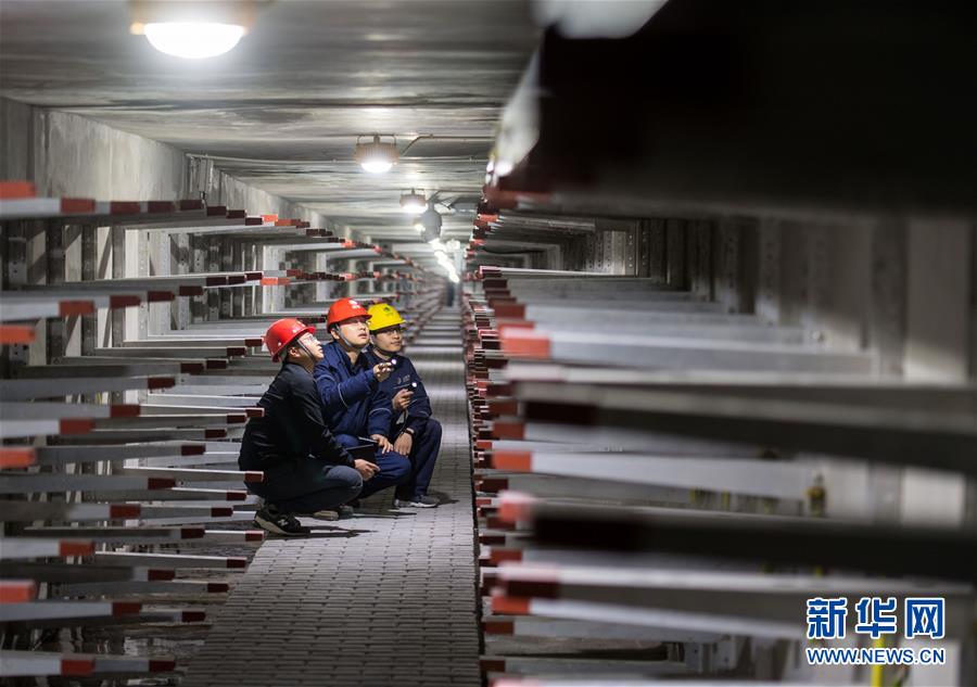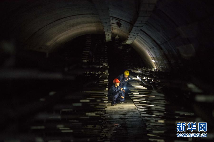 11月24日,解放碑地下环形电力隧道的一段支线电力隧道内,两名国网重庆市区供电公司的技术人员(右一、右二)在对预留的商业用户接入隧道的电力设施设备进行竣工验收。当日,经过3年多的紧张建设,重庆地下环形“电力高速路”——解放碑地下环形电力隧道工程顺利通过竣工验收,并正式投入运行。解放碑环形电力隧道总长2408米,其中1198米的干线电力隧道已经成功接入解放碑商圈及周边地区的4个110千伏变电站形成环线,支线电力隧道1210米也开始陆续接入用户。据介绍,作为重庆市重点工程,2013年7月开工建设的解放碑地下环形电力隧道按照满足未来20年电力需求设计,隧道高2.8米、宽2.4米,投入运行后将解决重庆渝中半岛和重庆最繁华的解放碑商业区配电设施老化、无法扩建等问题,使解放碑商圈供电负荷承载能力得到极大加强。新华社记者 刘潺 摄
