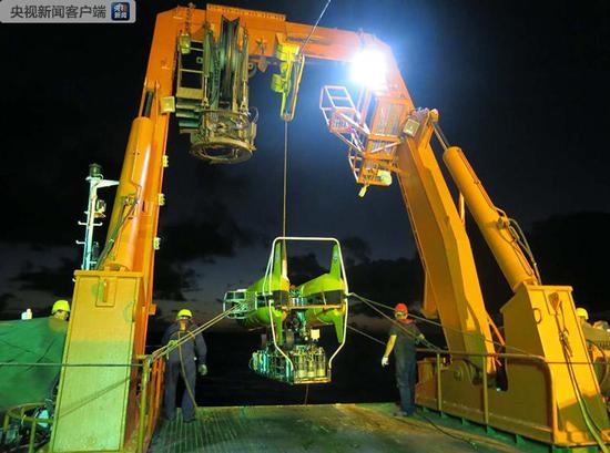 6月1日,“蛟龙”号载人潜水器深潜归来,工作人员在将其回收至“向阳红09”科学考察船上。