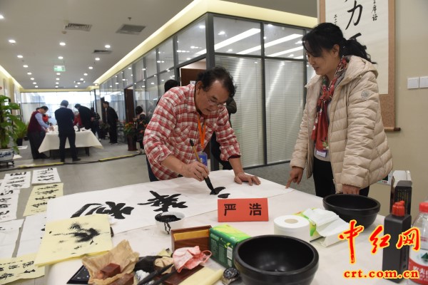 纪念联合国国际科学与和平周31周年系列主题活动之一书法笔会于2019年11月11日在京举行,这是中国翰林书画院 副院长、中国书画家协会 副会长:严浩严浩在笔会现场,(杨建国摄)
