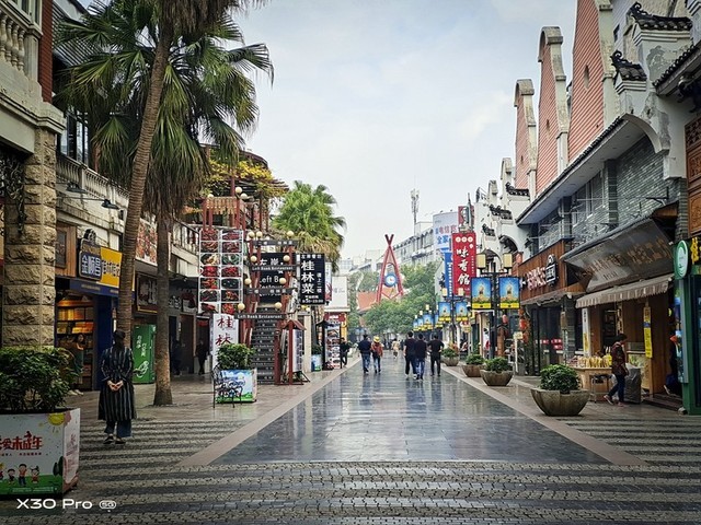 对于vivo X30 Pro而言,它最具吸引力的便是这颗潜望式长焦镜头,它可以带领你的视线去远方,发现远方更多的美好,在实拍过程中,笔者选取了几个原本只有专业摄影师使用长焦镜头所能拍摄的场景进行拍摄,在实操中体验它的长焦拍照能力。首先,笔者来到了桂林著名的东西巷步行街,在步行街的最远处约500米的位置拍摄街中心的钟表塔,分别以超广角、1倍、5倍、60倍变焦拍摄,5倍变焦下,画面空间视角十分合适,发挥了长焦镜头压缩空间的优势,60倍数码变焦可以清晰的看到钟表时间的细节,画面清晰,堪比望远镜效果。