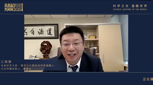 未来科学大奖 - 数学与计算机科学奖捐赠人,分众传媒创始人、董事长江南春表示:数学是未来科学发展的基础,是未来高科技竞争力的核心关键。未来科学大奖成立五年来,不仅礼赞科学家、对科学精神的致敬,同时也树立了一种社会的示范效应,告诉大家从小就要学好数学、学好计算机、争当科学家,让科学家成为孩子们心中的明星和榜样,激发民间的科学热情。
