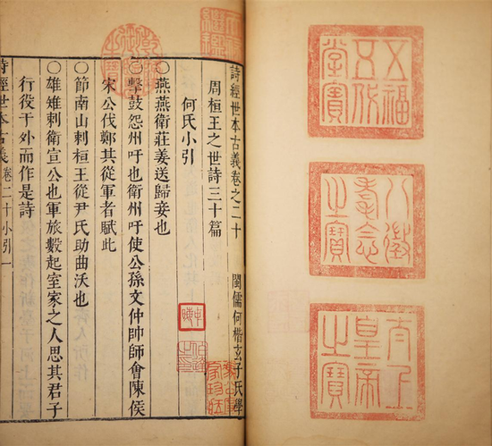 这是明崇祯十四年(1641)刻本,是《诗经世本古义》的初刻之本。原书二函十六册,其中卷十至十七、二十五至二十八,计十二卷,三册,现藏中国国家图书馆;卷十八上,一册,现藏中国文化遗产研究院(原中国文物研究所)。国图所藏三册系1959年自故宫博物院调拨。文研所所藏一册,系陈伯达旧藏。合此三册,与国图、文研所两家,尚未拼成全帙。