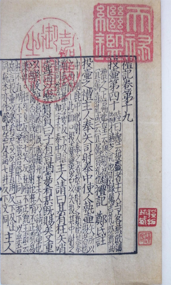 《礼记》为儒家经典之一,乃秦汉以前各种礼仪论著之选集,传为西汉礼学博士戴圣所编。历代注本众多,有东汉郑玄《礼记注》、唐孔颖达《礼记正义》等。此为宋刻巾箱本,应是刊于南宋光宗年间。