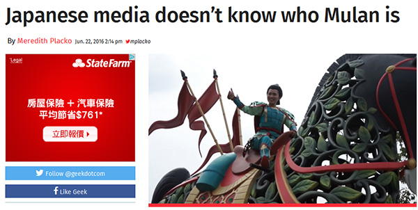 美国极客网(Geek.com)报道称,迪士尼的“木兰”形象已经18岁了,虽然她不是迪士尼最受欢迎的角色,但无疑大多数人是认识她的,除了日本人……