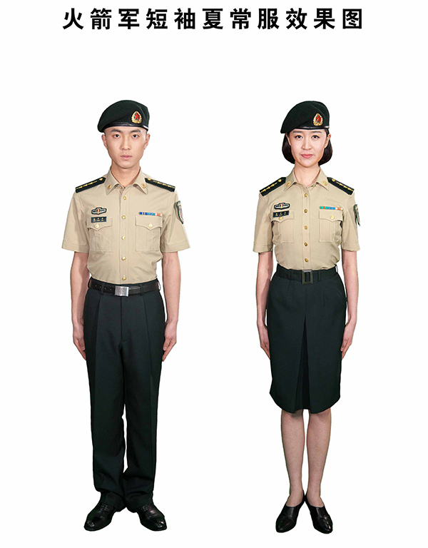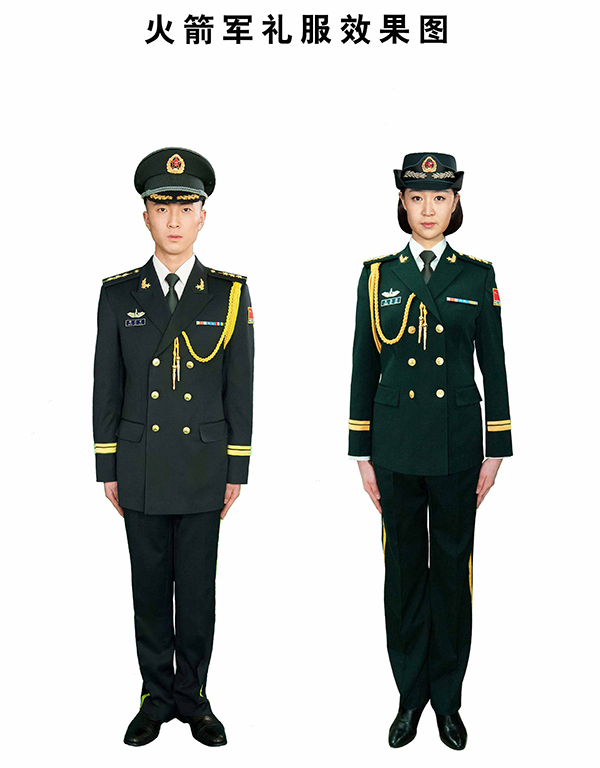 国防部新闻发言人吴谦说,经中央军委批准,火箭军将于7月1日换发新式礼(常)服。这次换发的火箭军新式礼(常)服,是在现行07式军服体系内,保持礼(常)服样式、结构、材料不变,对服装颜色进行设计调整,新式礼(常)服主色调采用墨绿色,衬衣和长(短)袖夏常服上衣为卡其色,礼(常)服大(卷)檐帽牙线和领带为浅墨绿色。