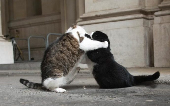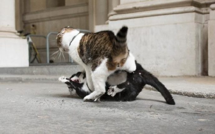 7月17日,“外交部首席捕鼠猫”Palmerston偷偷溜进唐宁街10号,并在内务府门口和Larry爆发了一场战争。从画面来看,两猫不相上下,甚至Larry多次占上风,或将对方扑倒,或将其踩在脚下。