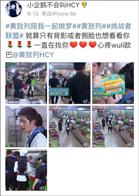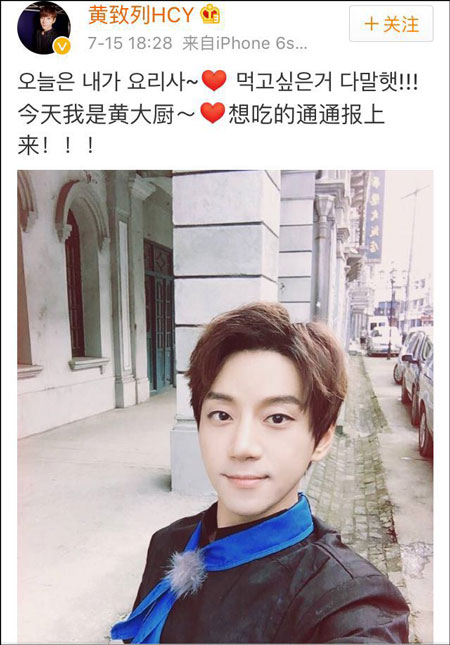 今年7月,黄致列参与录制《挑战者联盟》,当时,他还开心地拍下和队友穿相同厨师服的照片,在微博上兴奋地说:“今天我是黄大厨~想吃的通通报上来!”