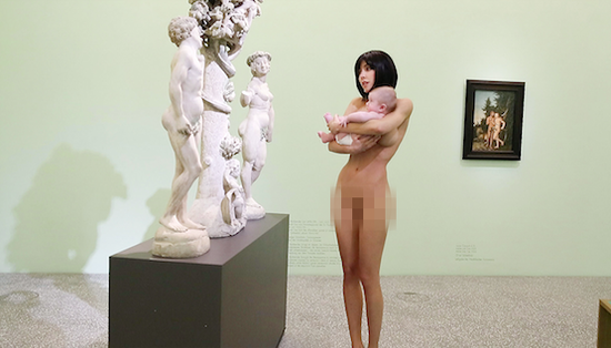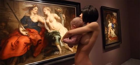 ▼ 赤裸着在博物馆里,抱着一个婴儿;