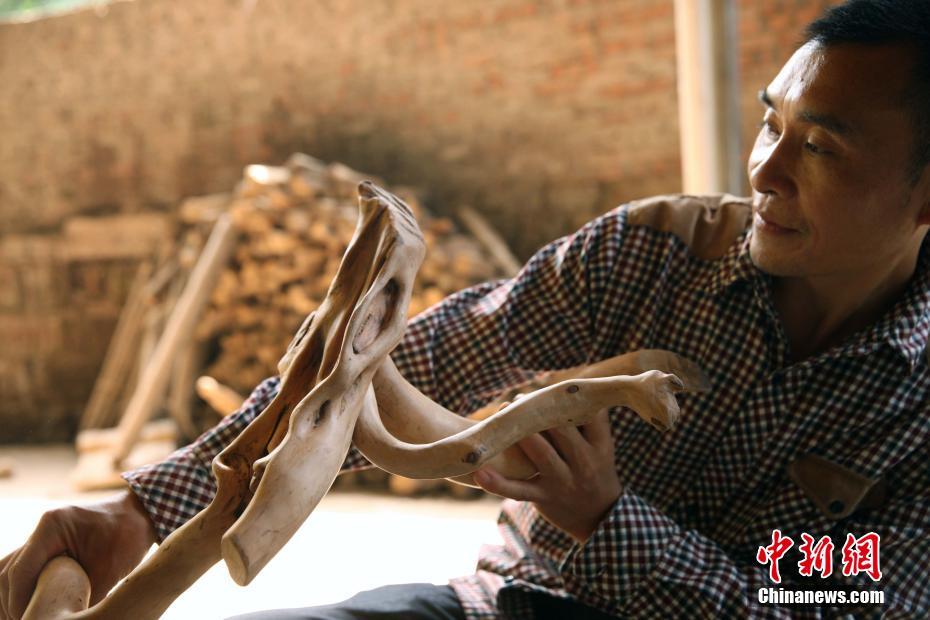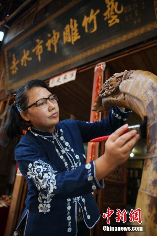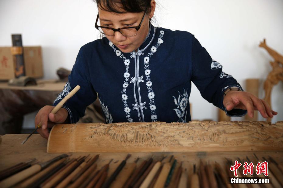 贵州赤水是中国“十大竹乡”之首。全市现有竹林面积131万亩,其中楠竹51万亩,杂竹80万亩,年产商品楠竹600万根。如何开发宝贵的竹资源是赤水人繁荣经济和开发特色旅游商品的大事。图为四十四岁的残疾人晏伯伦,已经干木刻十多年了,成了赤水远近闻名的民间艺人。中新社发 丁伟 摄