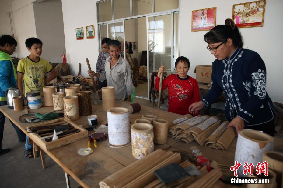 贵州赤水是中国“十大竹乡”之首。全市现有竹林面积131万亩,其中楠竹51万亩,杂竹80万亩,年产商品楠竹600万根。如何开发宝贵的竹资源是赤水人繁荣经济和开发特色旅游商品的大事。赤水市政协委员、传统工艺美术大师卢华英是竹品手工艺的带头人,她不仅不断开发以竹子为原料的手工艺品,而且免费传授雕刻技艺并带领残疾人脱贫致富。图为卢华英带领残疾人一块学习竹品雕刻。中新社发 丁伟 摄