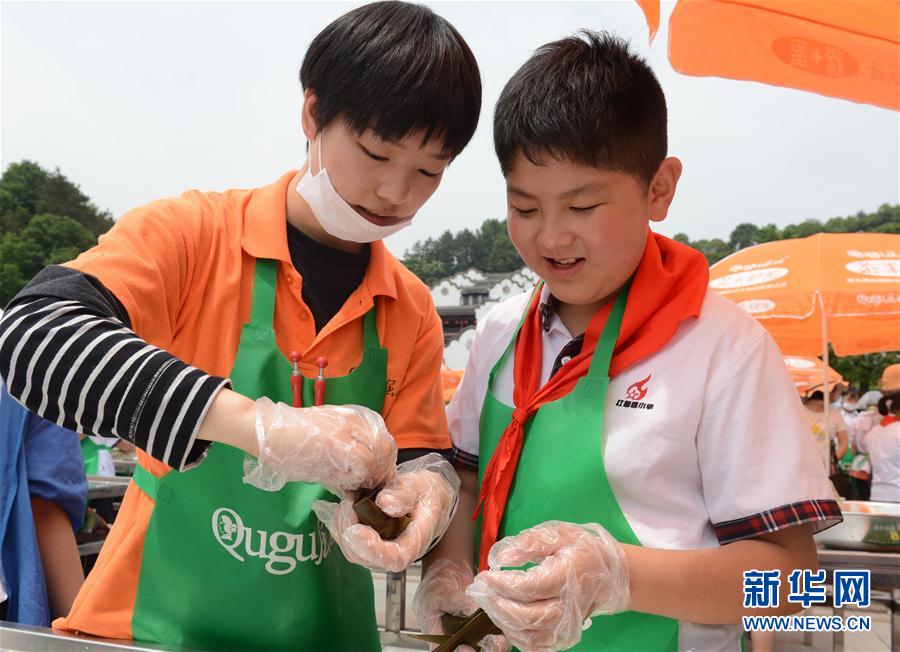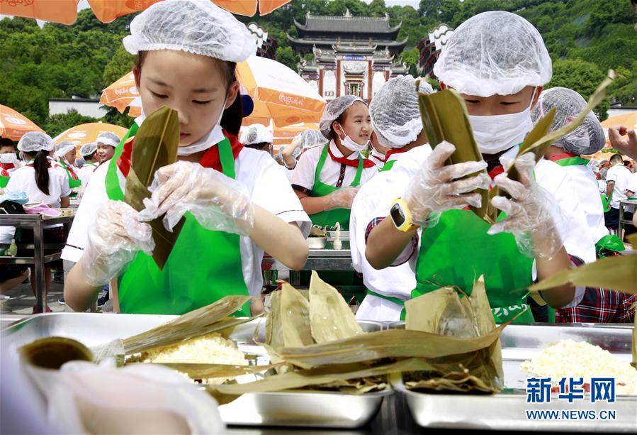 5月10日,来自湖北宜昌的小学生在湖北省秭归县屈原故里景区学包粽子。