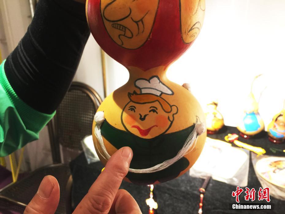 近日,在兰州文化创意产业园内,兰州艺人丁永莲展出自己的创意葫芦,供市民参观。她将葫芦雕刻与漫画二者结合起来进行创作,作品涉及人物漫画、环保宣传、寓言故事等,形象生动,趣味十足。徐雪 摄