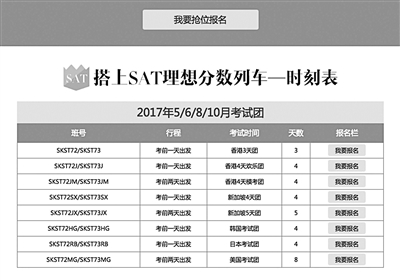 北青报记者上网搜索“SAT考团”,十几页各式教育机构组织的“SAT考团”就让人挑花眼,酒店、机票、辅导、报名……这个看似麻烦的跨境赶考在“SAT考团”的安排中貌似已经发展成熟。