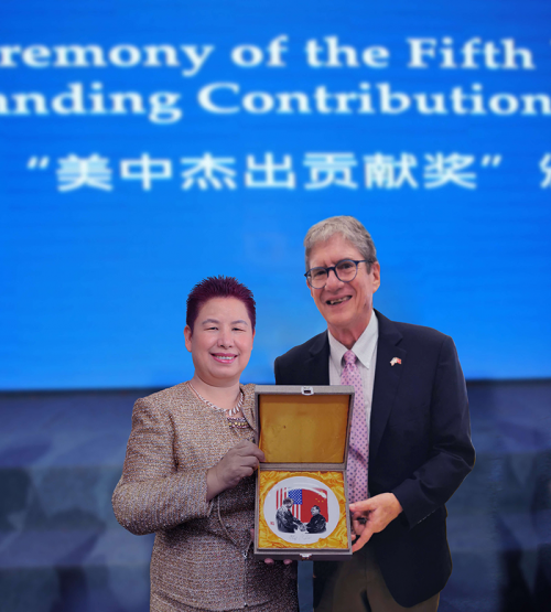 图:中美建交40周年纪念瓷盘记录了当年美国前总统卡特与邓小平友好建交的中美历史。卡特儿子奇普·卡特在纪念瓷盘上签名,并与万玉华合影留念。