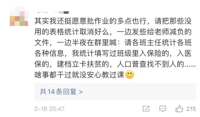 从网友评论可以看出,一些琐碎的行政工作令老师们身心俱疲,让教师回到本职工作,不止是家长们的呼声,也是老师们的期盼。