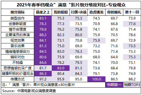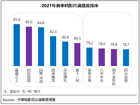 2021年春季档对从四月初到“五一”在内的10部重点国产影片进行了调研,其中6部影片满意度超80分进入“满意”区间。其中,“五一”期间上映的6部影片中,《悬崖之上》《扫黑·决战》《追虎擒龙》《你的婚礼》满意度均超80分。