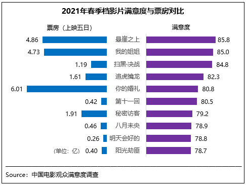 中国电影观众满意度调查2021年春季档调查结果显示,春季档观众满意度得分83.1分,为2015年开始调查以来同档期最高分,较2019年同期上涨1.6分。其中“五一”期间上映的谍战片《悬崖之上》以85.8分夺得档期满意度冠军,清明假期上映的亲情片《我的姐姐》以85.0分居档期第二位,4月21日压哨定档“五一”的犯罪剧情片《扫黑·决战》满意度84.8分居档期第三位。