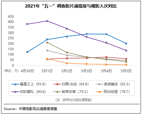 对比影片上映五天累计票房,可以看到观众满意度对观影人次及票房走势构成正向影响。《悬崖之上》和《我的姐姐》的高满意度有效吸引了观众,拉升了票房,《悬崖之上》日观影人次及票房自5月3日反超《你的婚礼》居档期首位,《我的姐姐》自4月2日上映后连续夺得14天观影人次及票房日冠。《扫黑·决战》满意度较高,观影人次及票房呈现上扬走势,从5月1日到5月4日,由第六排位升至第三排位,而同期满意度位居第五的《你的婚礼》观影人次及票房出现较大幅度下滑。同时,居于调查结果排序后三部的影片《八月未央》《明天会好的》和《阳光劫匪》观影人次均低于150万人次,票房则均未超5000万元。