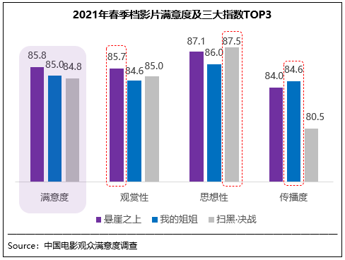 《悬崖之上》《我的姐姐》和《扫黑·决战》为档期满意度前三甲,在包揽档期影片观赏性、思想性和传播度前三位的同时,三部影片各领得一项指数头牌。张艺谋导演的《悬崖之上》打破了国产谍战片多年的沉寂,满意度85.8分,观赏性85.7分为档期最高;《我的姐姐》是青年演员张子枫首次担当主演的影片,通过两代 “姐姐”的故事折射社会现实,引发了观众的共鸣,传播度以84.6分居首;《扫黑·决战》为国内首部写真式展现全国扫黑除恶斗争的故事片,既直击社会痛点,又彰显国家行动之坚决有力,以87.5分获思想性之首。