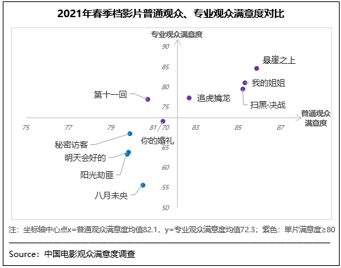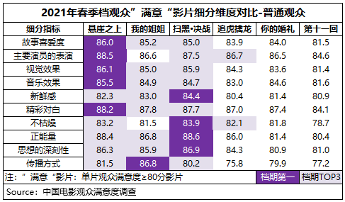2021年春季档影片整体品质较为分明,普通观众和专业观众评价排序基本趋同,调查的10部影片中,《悬崖之上》《我的姐姐》《扫黑·决战》《追虎擒龙》4部影片均获得了不同层次观众的相对较高评价,而《秘密访客》《八月未央》《明天会好的》《阳光劫匪》四部影片则评价均落后。《第十一回》和《你的婚礼》整体评价居中,其中专业观众对艺术性相对较强的剧情片《第十一回》评价相对较高,而普通观众则更偏爱青年明星参演、有大众共鸣度的爱情电影《你的婚礼》。