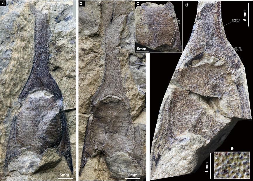 论文第一作者、中科院古脊椎所副研究员盖志琨介绍,长吻三歧鱼是一种约10厘米长的小鱼,前面吻突最长可达5厘米。这种鱼在分类上属于无颌类盔甲鱼亚纲三歧鱼科,其头甲形状形似古代兵器三叉戟。目前三歧鱼科仅有1属3个种,分别是长吻三歧鱼、昭通三歧鱼和越南三歧鱼,堪称三歧鱼三兄弟。