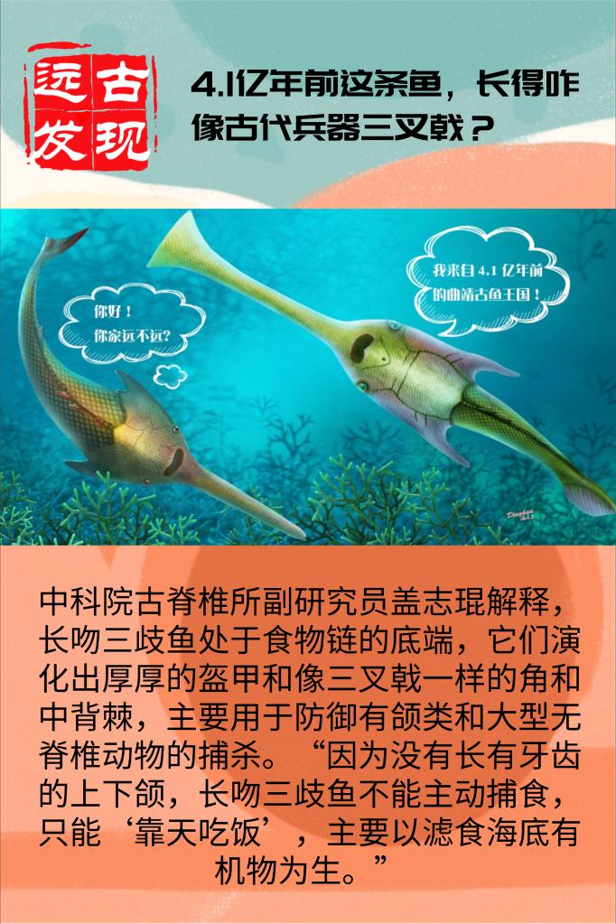 长吻三歧鱼为何长成这样?盖志琨解释,长吻三歧鱼处于食物链的底端,它们演化出厚厚的盔甲和像三叉戟一样的角和中背棘,主要用于防御有颌类和大型无脊椎动物的捕杀。“因为没有长有牙齿的上下颌,长吻三歧鱼不能主动捕食,只能‘靠天吃饭’,主要以滤食海底有机物为生,因此多生活在江河入海口、三角洲等靠近海岸、有机碎屑比较丰富的地方。”