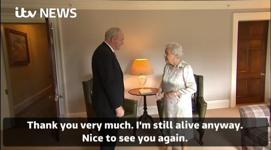 而女王和麦金尼斯会面时间达20分钟,刚到达会面处,麦金尼斯便伸出手问候女王:“哈啰,您好吗?”