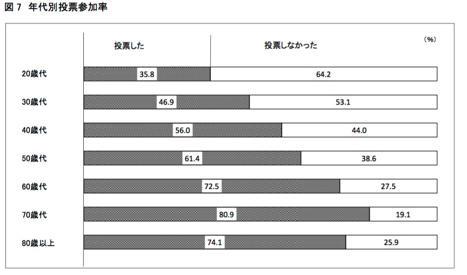 2013年日本总务省做的一次全国投票意识调研,其中20岁代(即年龄2字头的年轻人)投票意愿相当低。