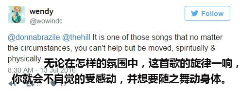 《华盛顿邮报》网站13日是这样描述的:在近5分钟的演奏中,前排的这些人大多数都保持静默,在音乐中默哀,或者默默的跟着哼唱,然而小布什,穿着一套颜色比别人的都欢脱的亮蓝色西装,对音乐的感知可能更深一点,他一手牵着自己的老婆劳拉,一手牵着奥巴马的老婆米歇尔,随着音乐摆动身体,但很显然,这两个人脸上都是大写的不情愿。他的脸上还挂着淡淡的微笑,尽管别人都在默哀。