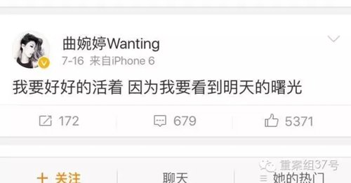 张明杰受审前夕,重案组37号翻了一下曲婉婷的微博,2015年10月后一直没有更新微博的曲婉婷在今年7月16日突然更新了一条微博“我要好好的活着,因为我要看到明天的曙光”。
