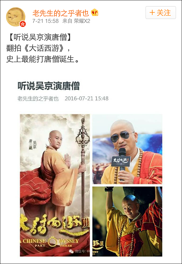 7月21日,新浪博主@老先生的之乎者也,分享了一张长图:“翻拍《大话西游》,史上最能打唐僧诞生”。