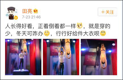 昨天晚上,重拾自信的田亮同学在微博上打趣道,反正人长得好看,正着倒着都一样!