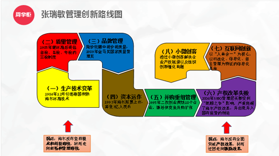 从张瑞敏的管理创新脉络上,我们基本上可以看到3个主要的线索,第一个线索是产品线索,包括技术创新、质量改良和品牌渠道;一个是资本线索,包括激活休克鱼的兼并重组,以及并购扩张,乃至产权改革;最后一个是互联网时代创新。