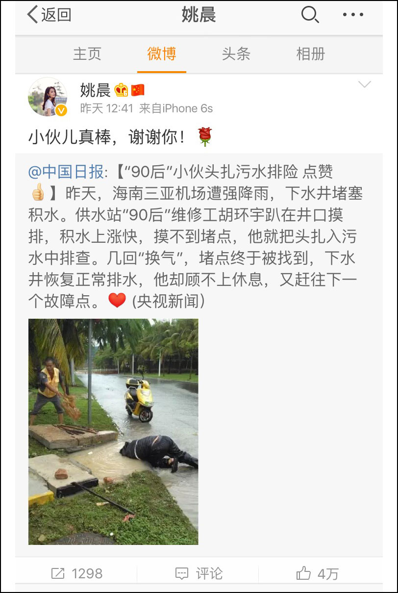 “事实上,同事曲昕当时拍这张照片只是普通的工作汇报,没想到会引起这么大的反响。”谈起胡环宇先后4次头扎下水井徒手挖垃圾受到许多网友点赞,三亚凤凰国际机场供水站主管孟宪晨说,同事们看到照片后,被胡环宇感动的同时,纷纷分享到微信朋友圈。连演员姚晨也为三亚小伙儿扎头污水排险的事所感动,并在她的微博转发,短短3个小时,她的粉丝转发1000多次,点赞超过3万多次。