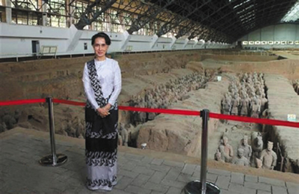 当天上午,缅甸国务资政昂山素季走进西安秦始皇兵马俑博物馆,领略了两千多年前秦俑军阵的磅礴气势,圆了她多年来的“秦俑梦”。参观秦始皇兵马俑、瞻仰法门寺佛指舍利、听陕西农民介绍发展“一村一品”的经验……读过许多有关中国书籍的昂山素季,西安之行让她有机会全方位了解一个从历史深处走来的国家。