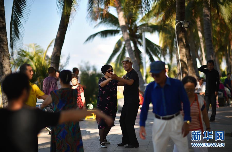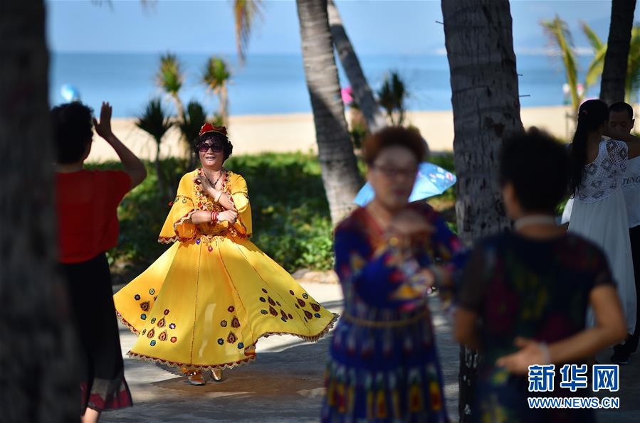 10月28日,老人们在三亚湾跳舞。随着北方天气逐渐变冷,众多老年人开始了一年一度的“南飞”。在海南省三亚市,越来越多的“候鸟老人”来到这里享受阳光、沙滩、椰林。新华社记者 郭程 摄